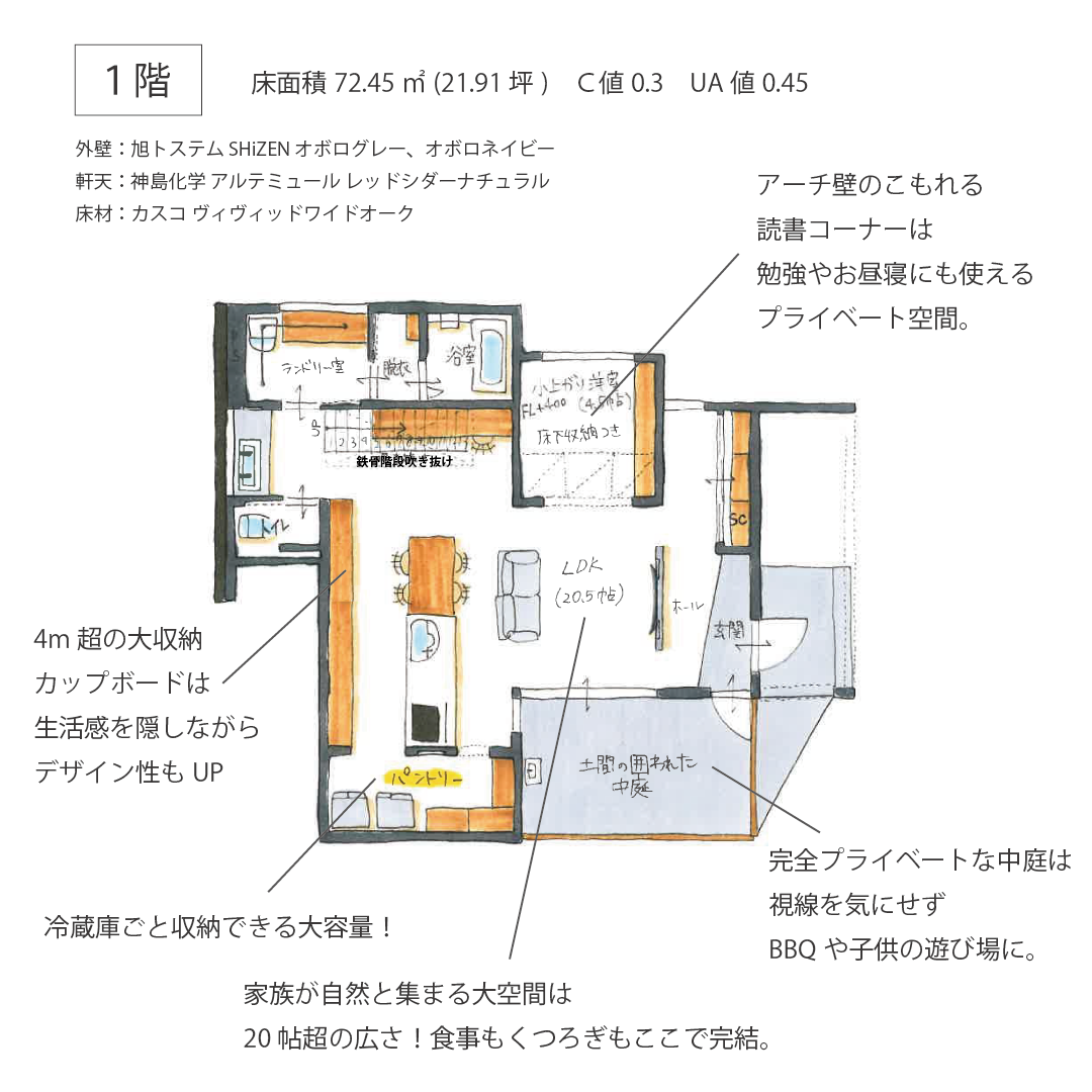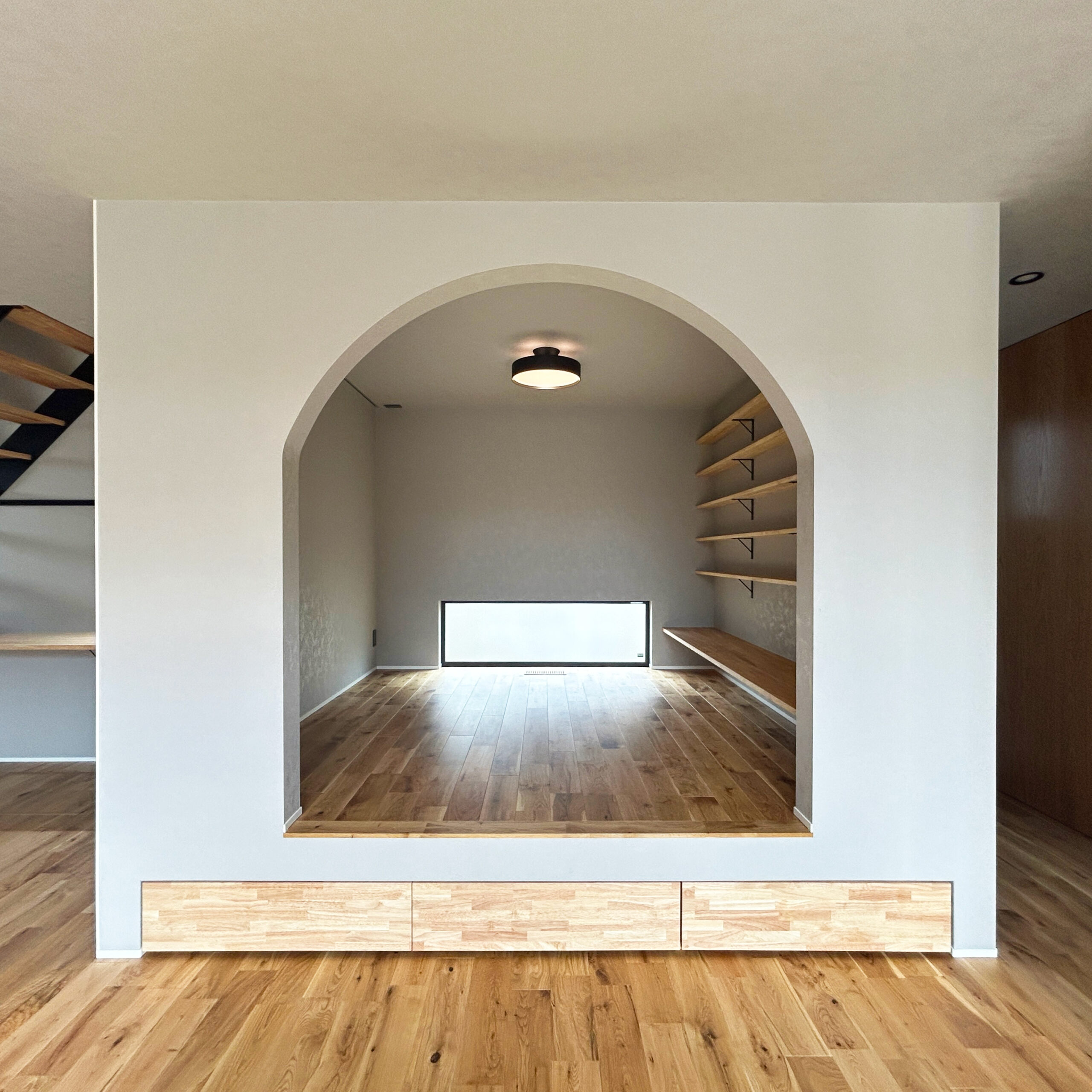 土間の囲われた中庭は、外からの視線を気にせず過ごせる完全プライベート空間。家族でのんびり過ごすのはもちろん、友人を招いてのホームパーティーや子どもの遊び場としても大活躍します。リビングとつながることで室内外の一体感が生まれ、自然光や風を心地よく取り込む設計に。開放感と安心感が同居する、日常にちょっとしたリゾート感を添える空間です。
