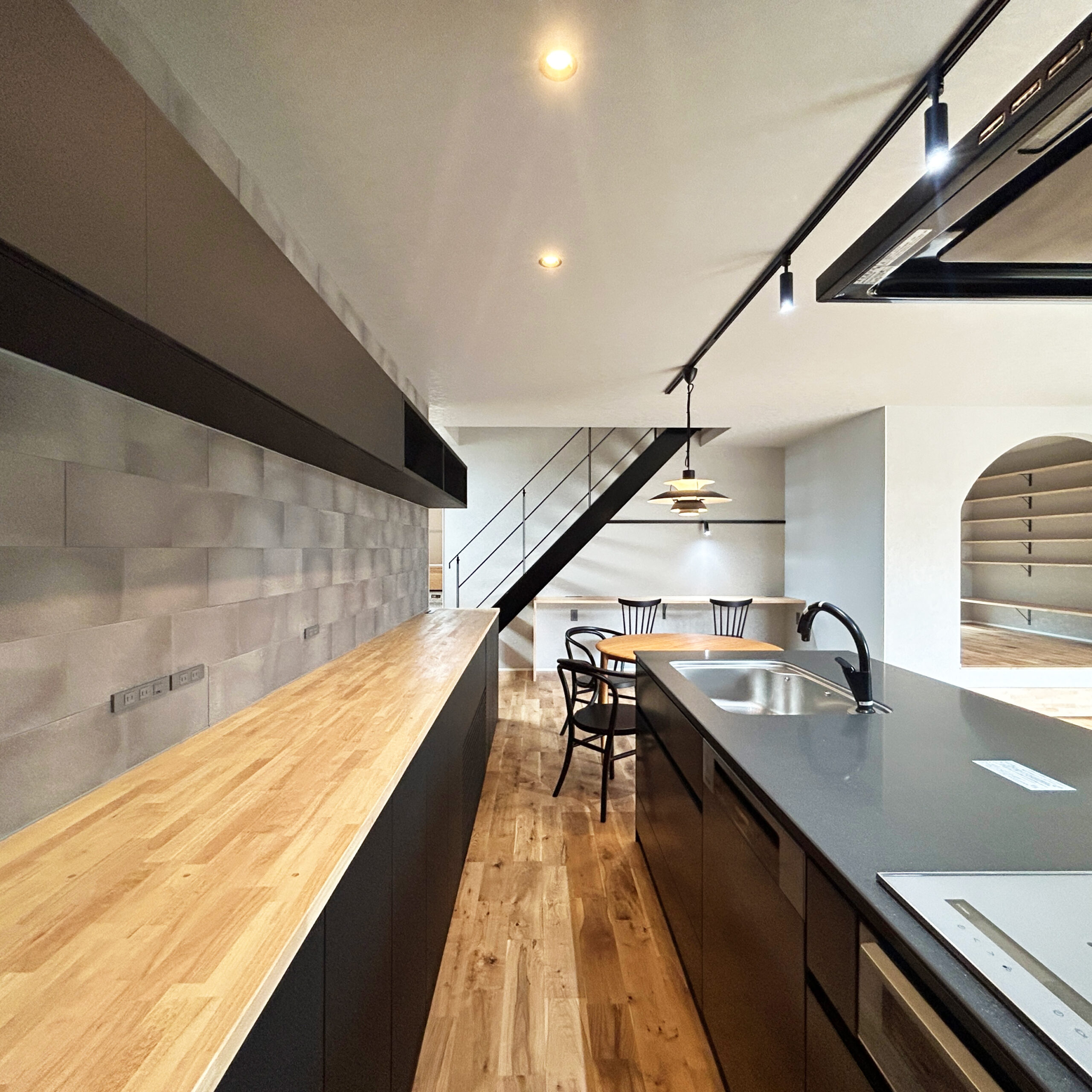 キッチンからリビングにかけて続く4m超の造作カップボードは、生活感をすっきりと隠しながらも大容量の収納を実現。壁面やスイッチを可能な限りシンプルにまとめることで、視覚的なノイズが排除され、洗練された空間が広がります。木目の温もりとグレーの落ち着きが調和し、暮らしやすさとデザイン性の両立を叶えました。