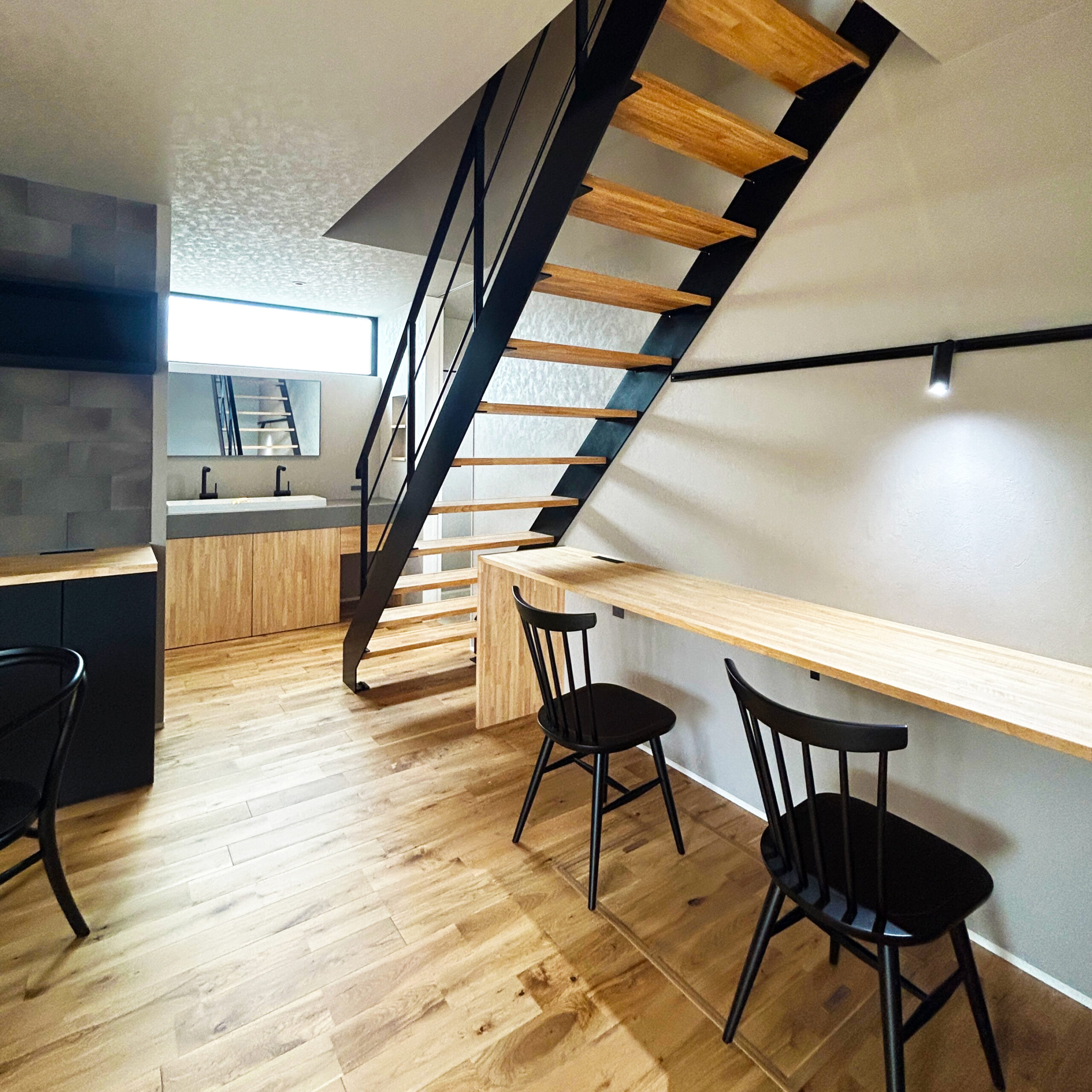 ダブル洗面台やファミリークローゼット、鉄骨階段下のデスクスペースなど、暮らしを効率的にする工夫が随所に。特に収納は「見せる」と「隠す」をバランスよく配置し、シューズクロークにはガラス扉を採用してインテリアの一部として楽しめる工夫も。無駄を削ぎ落としながら、生活に寄り添う造作を数多く取り入れたことで、すっきりとした美しさと実用性を兼ね備えました。
