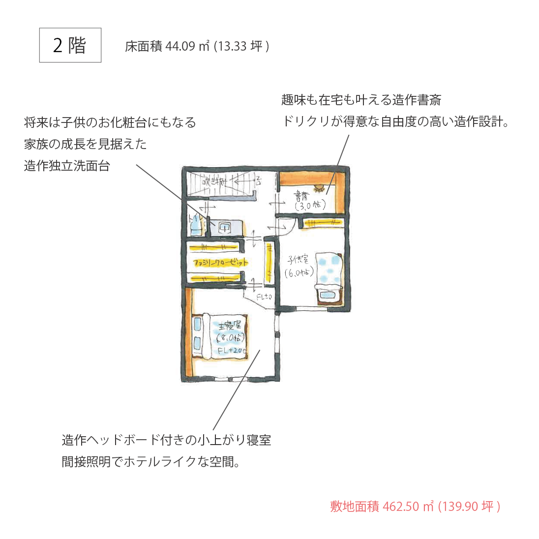 LDKには小上がりの読書スペースや勉強コーナーを配置し、家族とつながりながらも自分の時間を過ごせる工夫。さらに、ご主人こだわりの2階の造作書斎は、在宅ワークにも趣味にも使える集中空間。ドリームクリエイトが得意とする自由度の高い造作設計により、ワークデスクや収納棚もオーダーメイドで仕上げ、理想の使い心地を実現しました。2階のセカンド洗面台は、朝の混み合う時間帯でも快適さを保ちます。