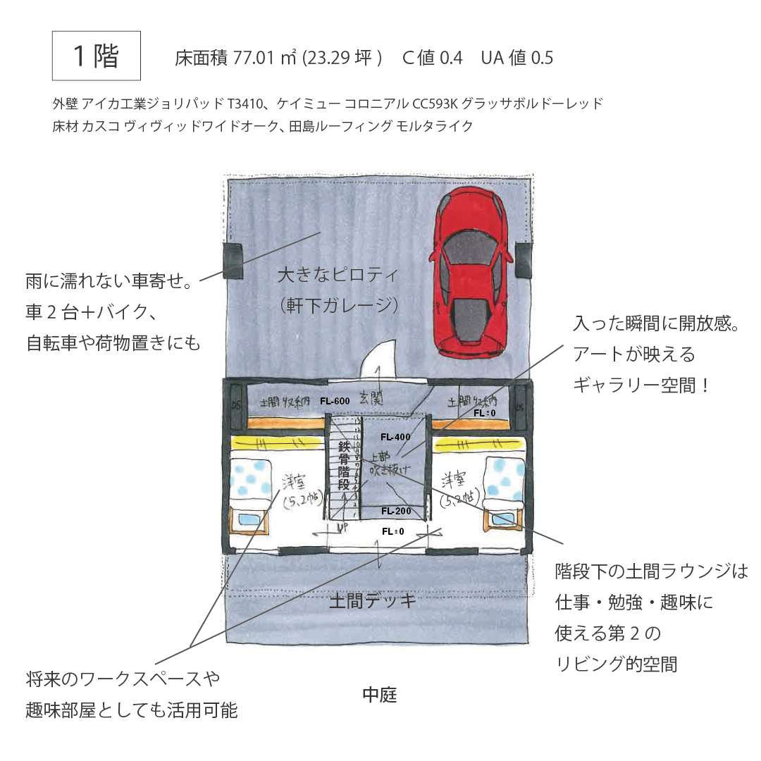 ギャラリーのようにアートが映える土間空間。趣味やワーク、大人の集まりにも使える多用途スペース。吹き抜けとストリップ階段が、空間に軽やかな広がりを与えます。