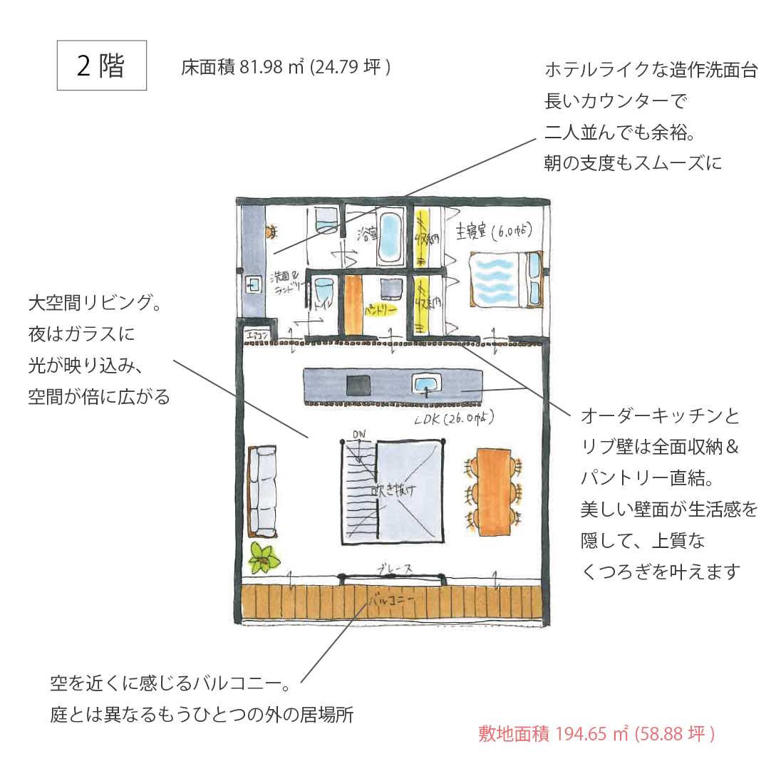 敷地を有効活用し、生活の中心をワンフロアにまとめた安心の動線。平屋志向の方に最適。土地条件に制約があっても、平屋の心地よさを取り込む“新しい住まい方”です。