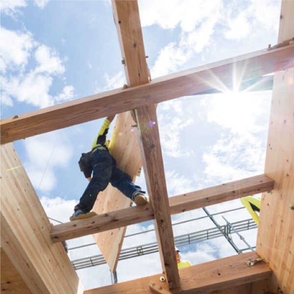 これは建物の底一面を鉄筋コンクリートの基礎で支える工法であり、地面からの湿気や白アリも防いでくれます。地震大国の日本で伝統的に用いられてきた柱と梁で縦の力に抵抗する木造軸組工法に加え、建物外周面に耐震性を上げる面材を施す6面体ボックス工法、接続部に金物を使うピン工法を採用することで、建物は横の力やねじれにも強いモノコック構造へと進化しました。