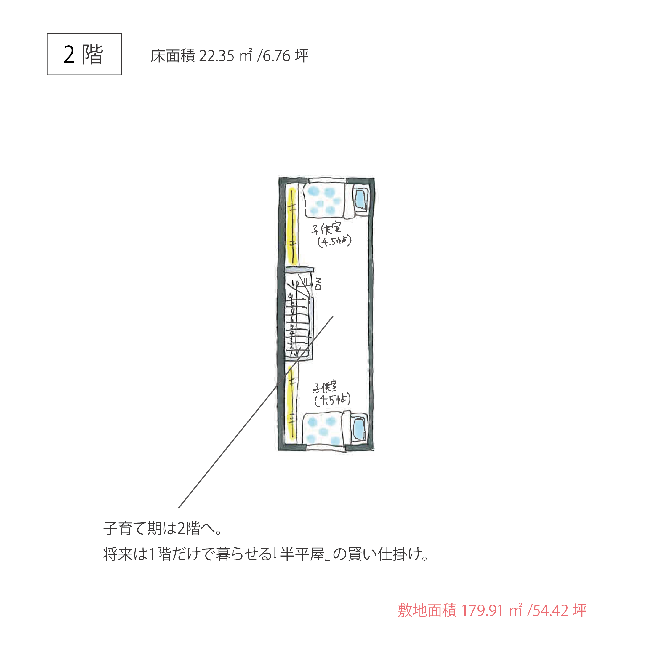 2階を子どもたちの場所に、1階を夫婦の永い住処に。子どもが個室を必要とする時期は、2階をフル活用。将来的に子どもたちが巣立った後は、1階だけで生活のすべてが完結する「半平屋」の設計です。ライフステージの変化に媚びず、いつまでも「隠れ家」としての居心地を損なわない、一生モノの間取りです。