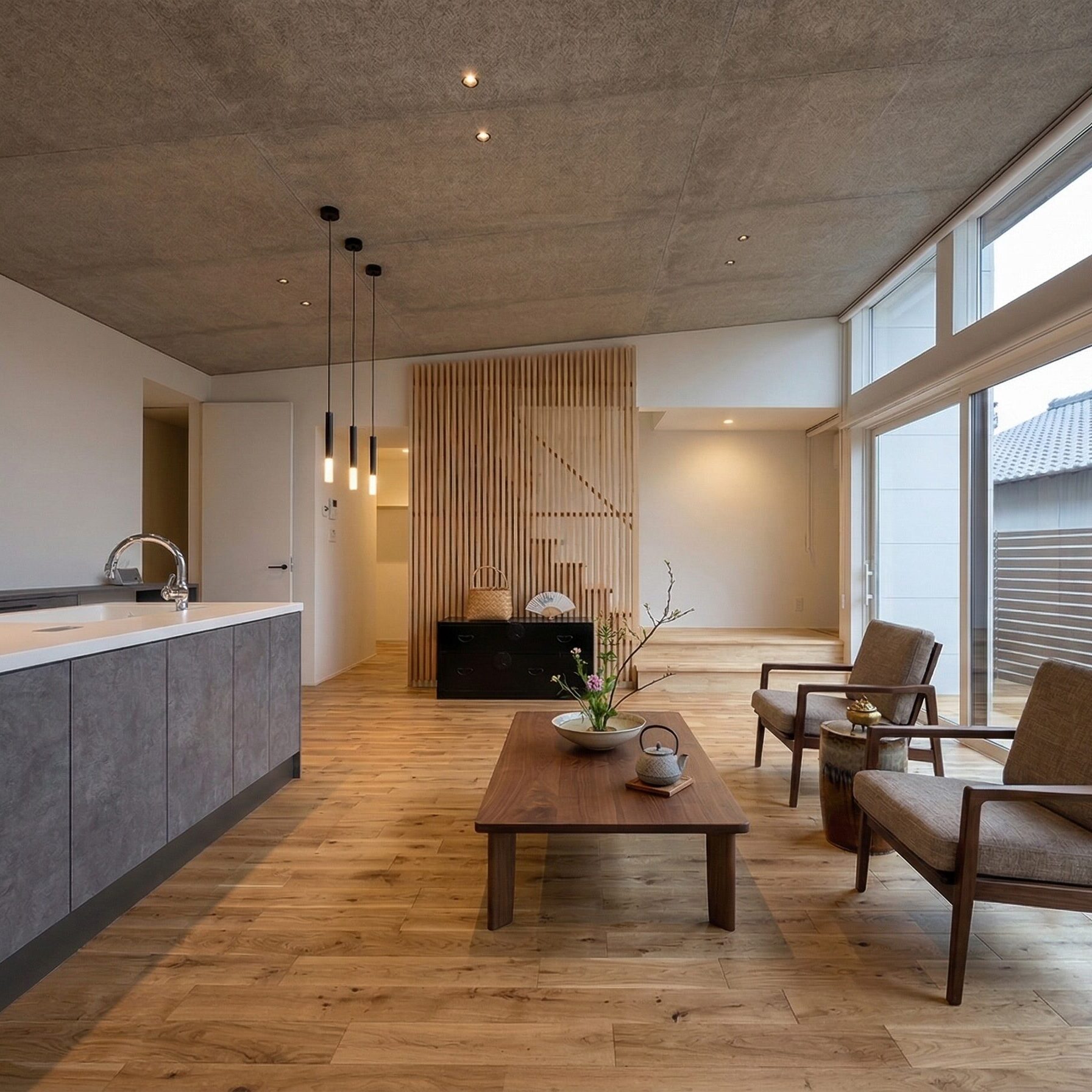 正面を大胆に覆う、圧倒的な存在感のルーバー。外からの視線をシャットアウトしながら、光と風だけを丁寧に招き入れます。それは、周囲の喧騒を消し去り、家族の時間を静寂で包むための「美しき防壁」です。