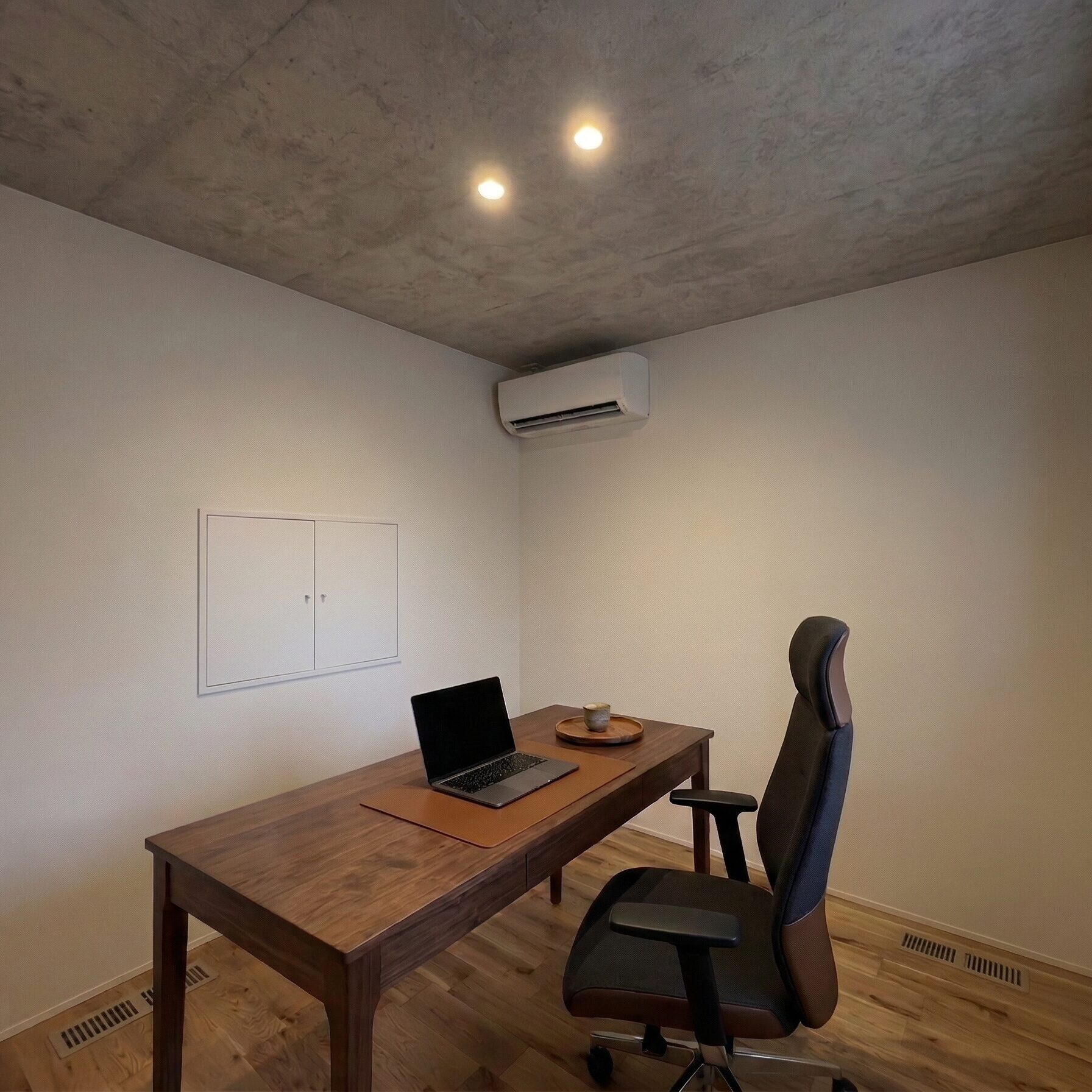 玄関を入ってすぐに配置された事務所は、生活空間を通らずに来客を迎えられるプロ仕様の設計。キッチンとつながる「お茶出し用の小窓」を設けることで、家族のプライバシーを守りながら、スムーズなおもてなしを可能にしました。仕事の機能性と、住まいとしての配慮が同居する空間です。