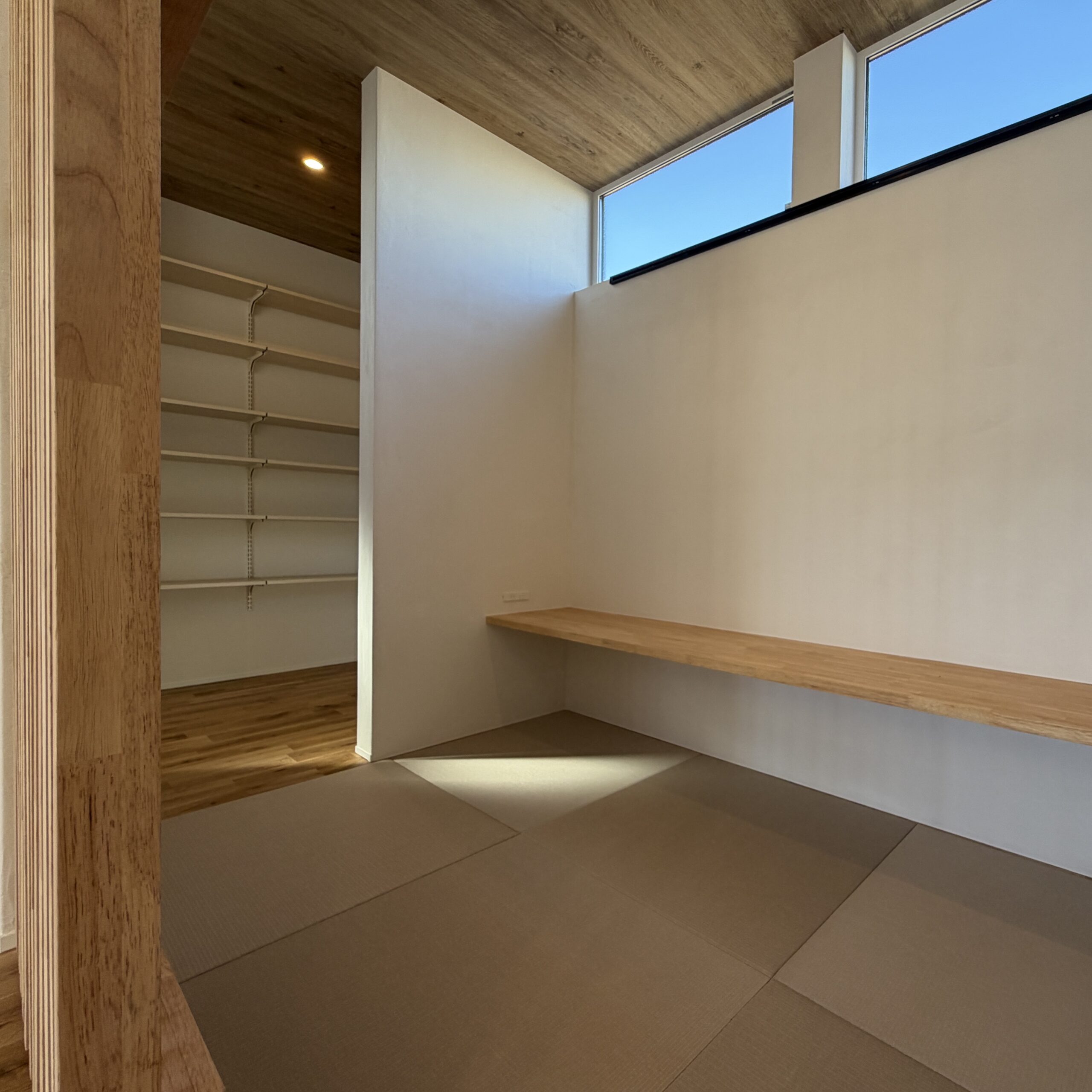 リビングから一段下がった場所に位置する、隠れ家のような畳の間。腰を下ろすと周囲の視線からふっと隠れ、自分だけの深い集中へと誘われます。リビングとつながりながらも、格子と段差が「静寂の境界線」を描く、知的なワークスペースです。