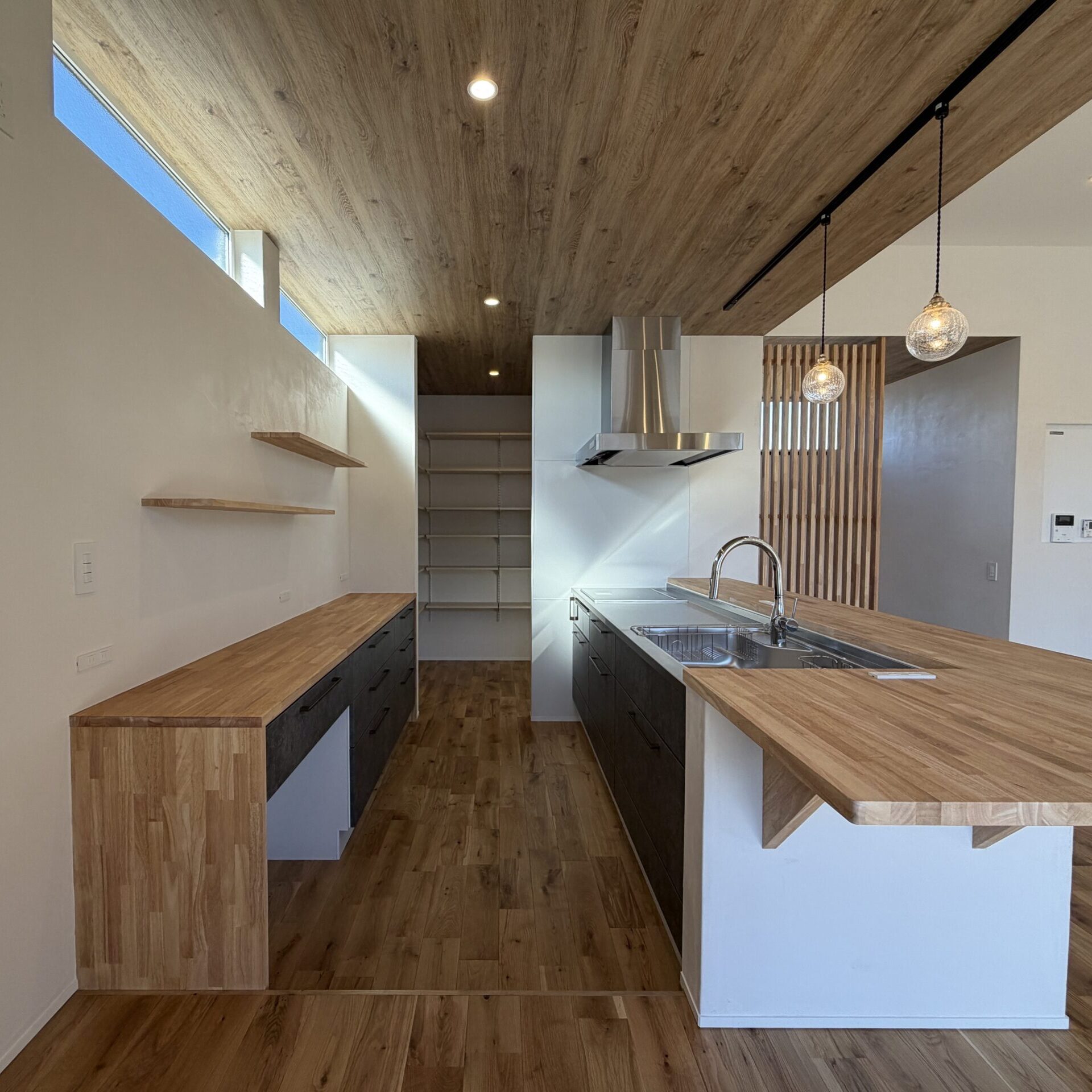 あえて一段下げたキッチンは、ダイニングに座る家族と目線を揃える特等席。手元の雑多さを隠しつつ、勾配天井のダイナミズムを一番低く、広く感じられる場所。調理の時間が、家族と語らう「劇的なステージ」に変わります。