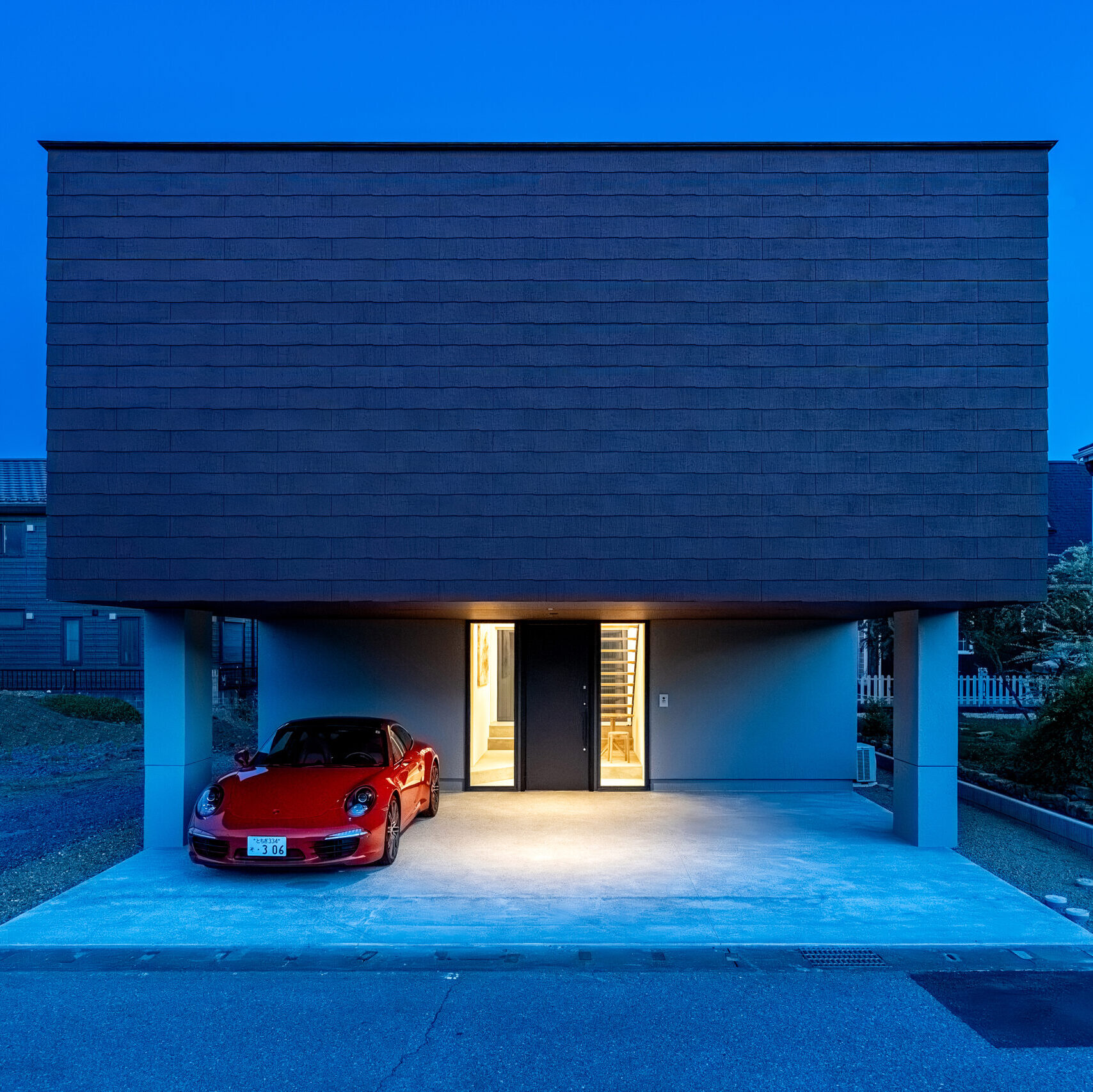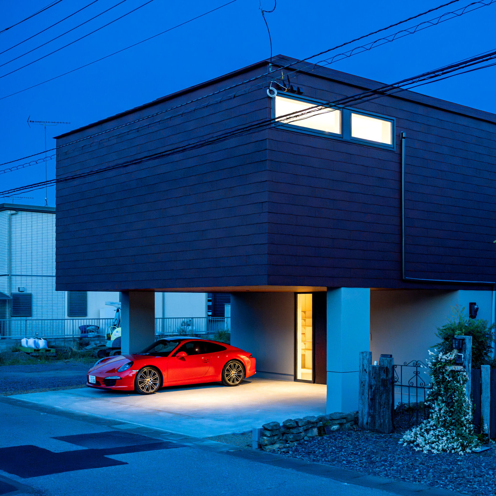宙に浮くように張り出したボリュームが街並みに陰影を生み、まるでアート作品のような存在感。昼と夜で異なる表情を見せ、住む人の個性を象徴するファサードになります。
