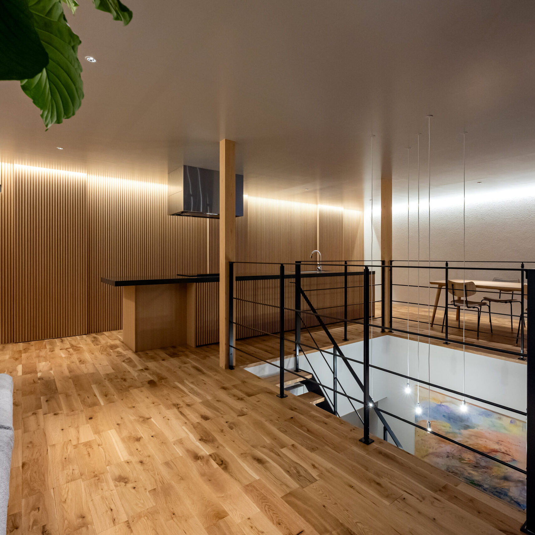ギャラリーのようにアートが映える土間空間。趣味やワーク、大人の集まりにも使える多用途スペース。吹き抜けとストリップ階段が、空間に軽やかな広がりを与えます。