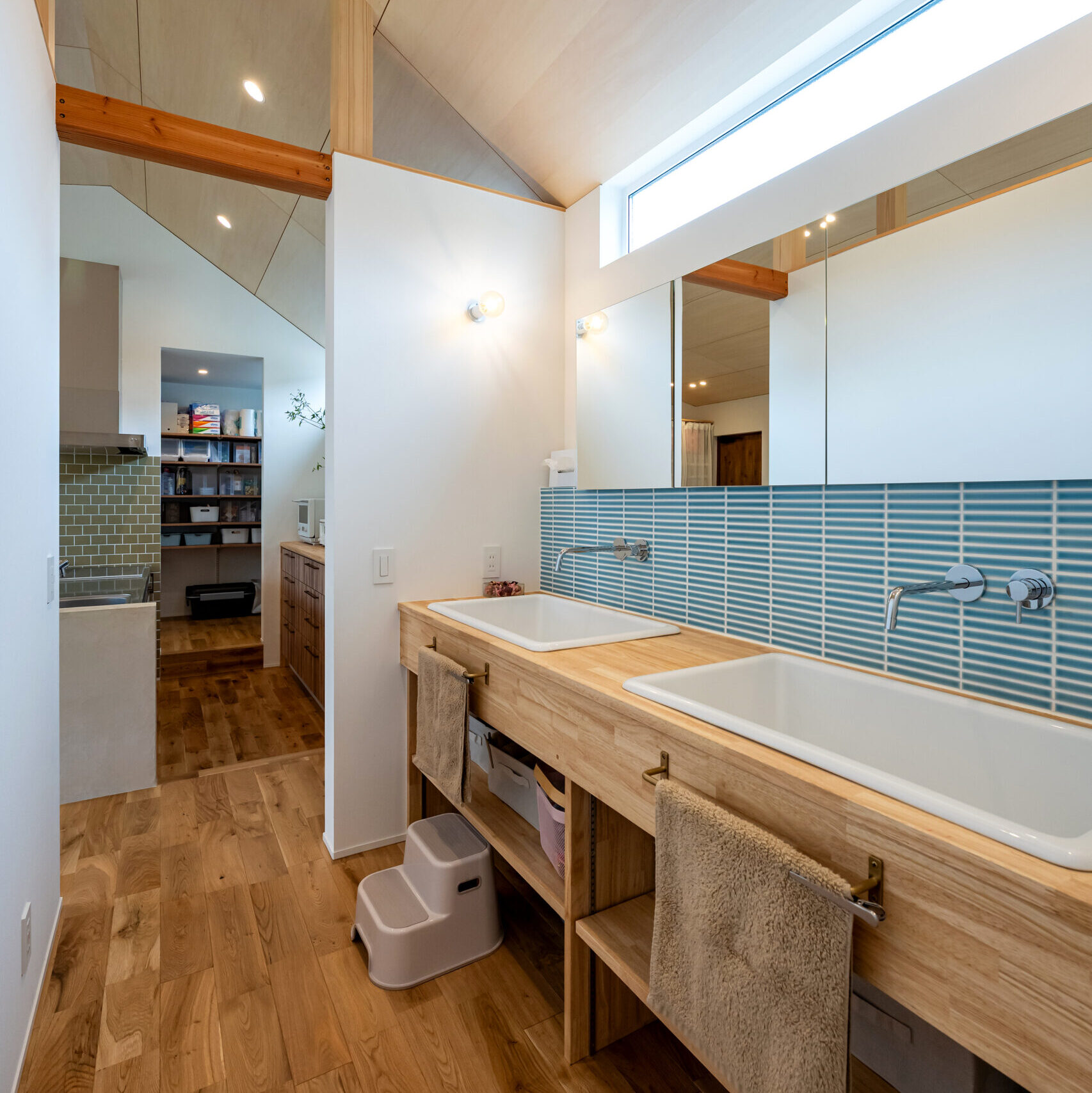 朝の身支度も、家族が並んで使えるゆったりとした造作ダブル洗面は、忙しい朝も混み合わず、家族みんながスムーズに使える実用性も魅力。