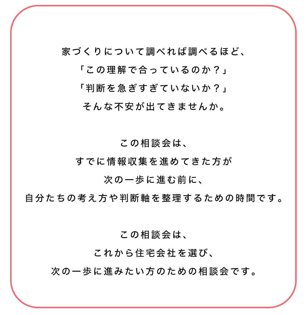 この相談会では、他社様のプランを評価したり、優劣をつけたりすることは行いません。代わりに、私たちがどんな考え方で家づくりをしているのかを正直にお話しします。この考え方に共感いただけるかどうかを、判断していただくための時間です。